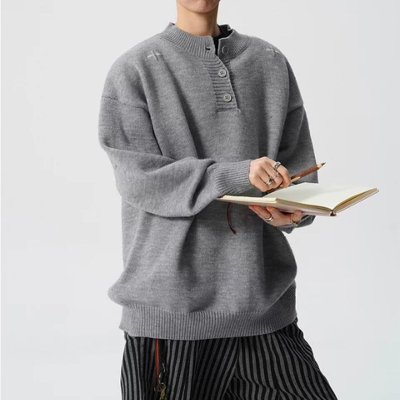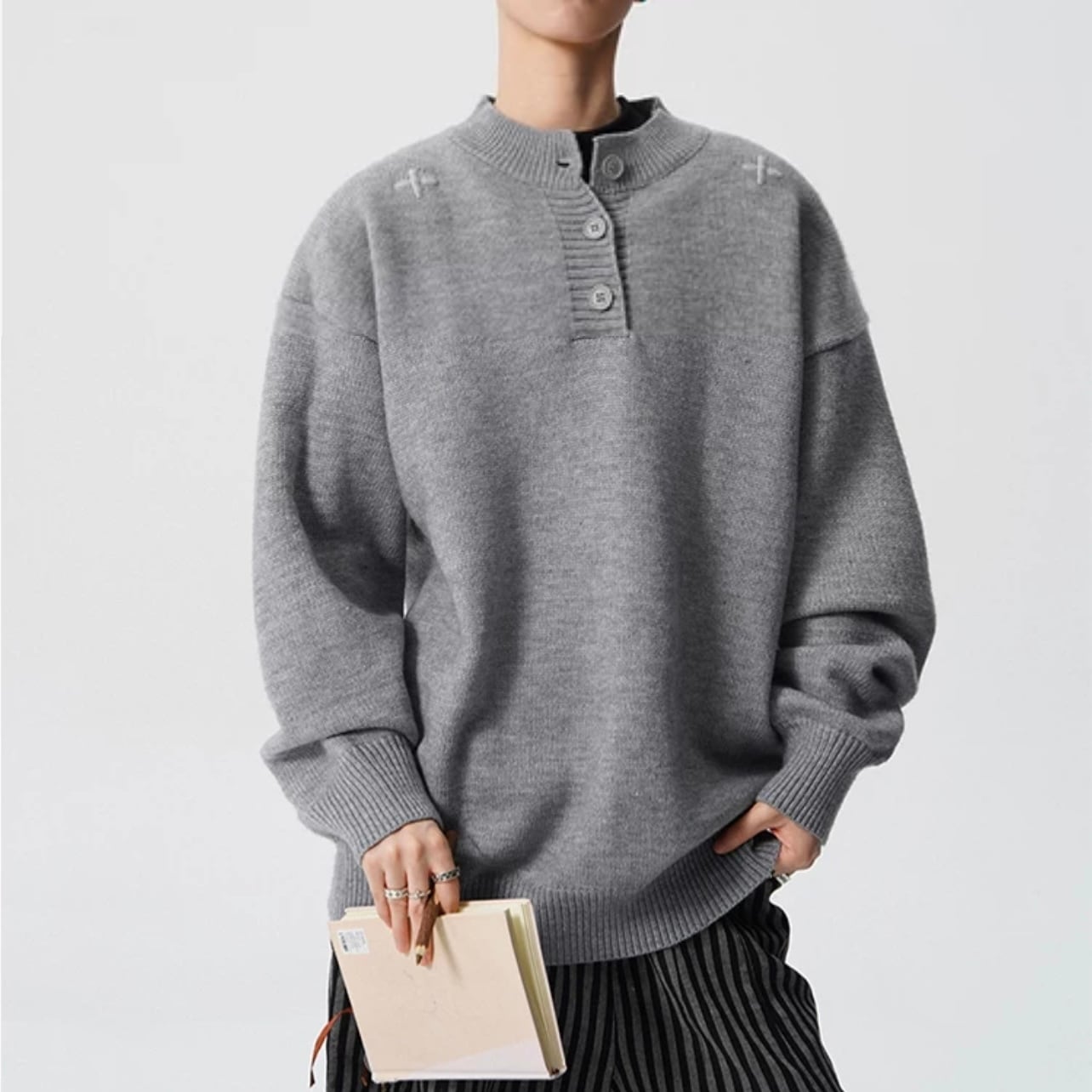 ネックラインのボタンがアクセントとなり、カジュアルながらも洗練された印象を与えます。