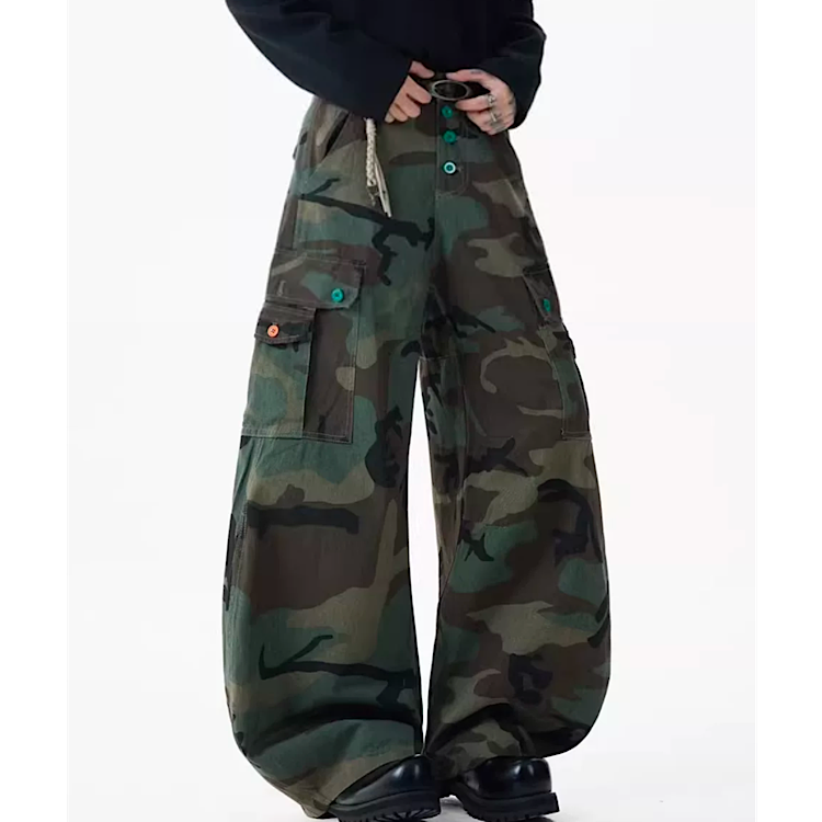 存在感のある迷彩柄が目を引くワイドカーゴパンツ。