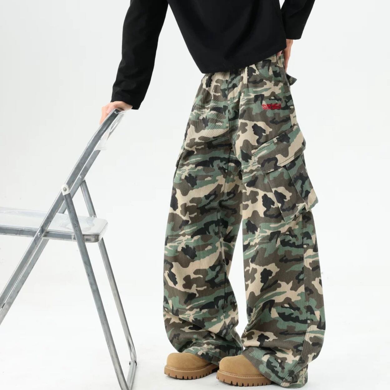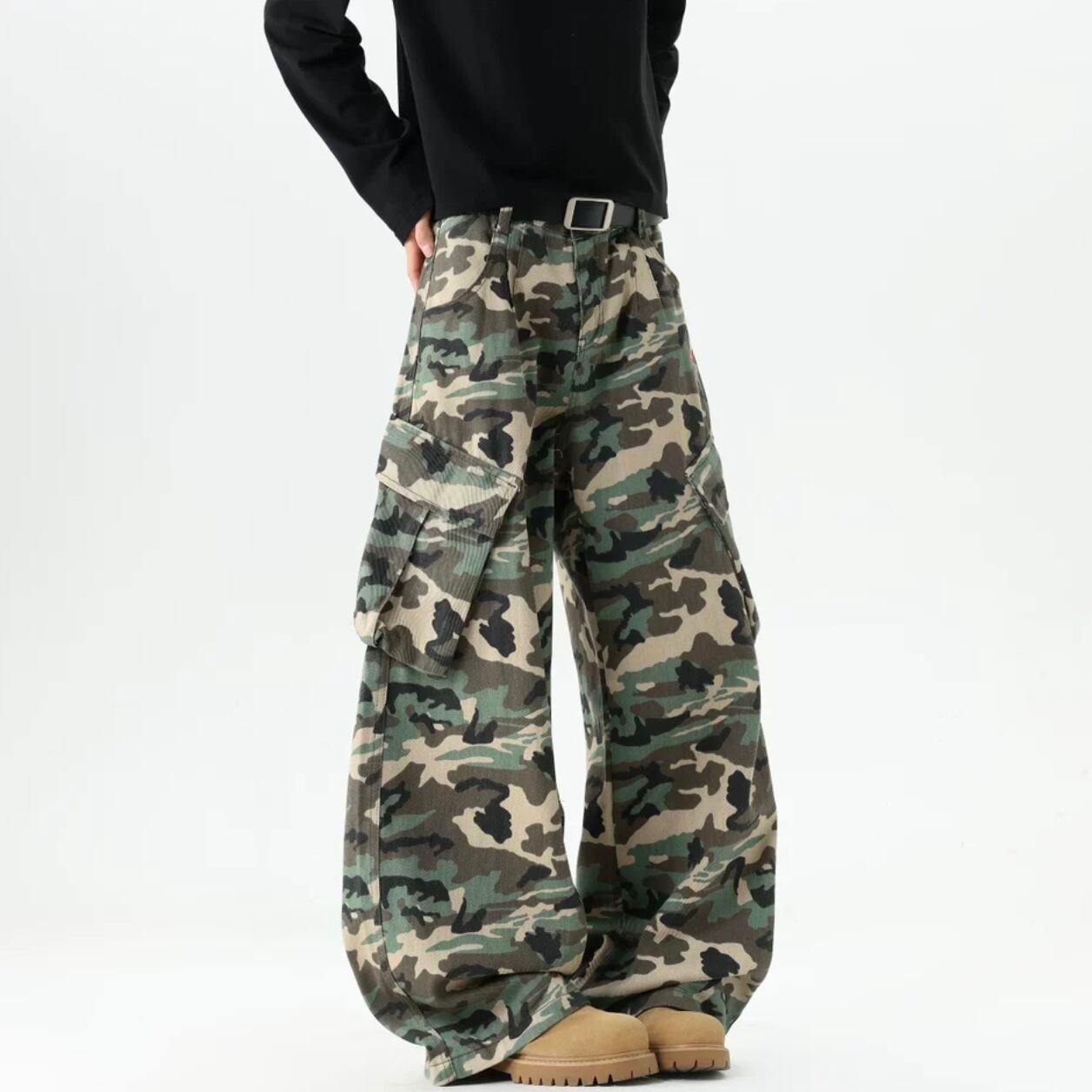ワイルドな存在感を放つ、迷彩柄ワイドカーゴパンツ。