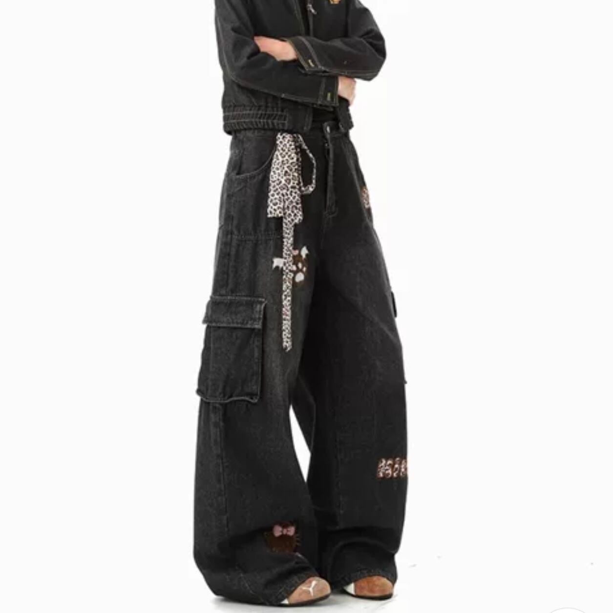 カーゴディテールがアクセントになった、ワイドシルエットのフルレングスデニムパンツ。