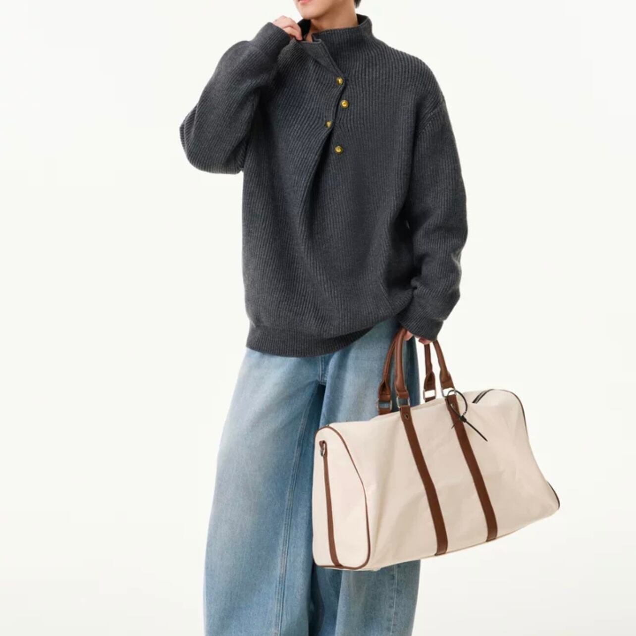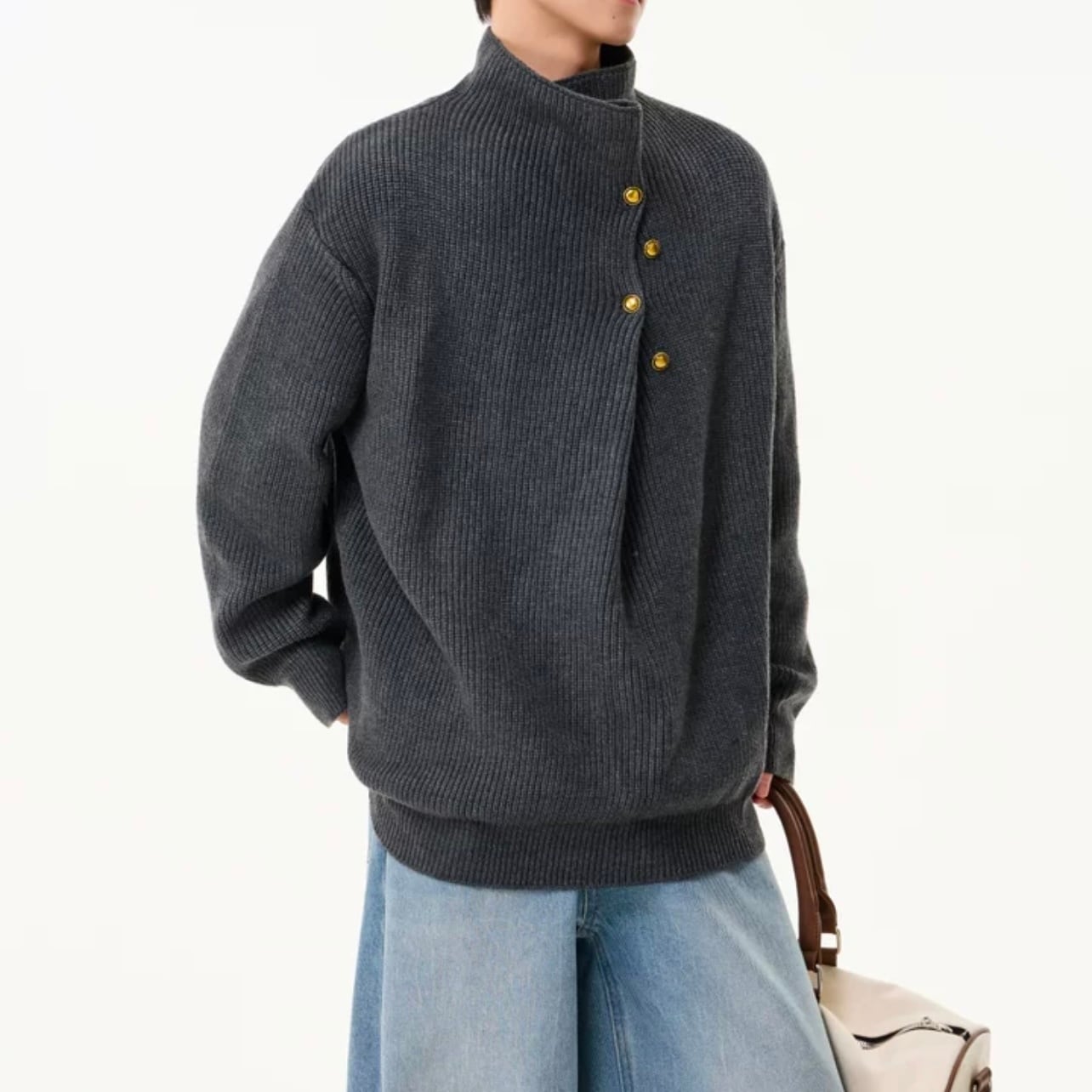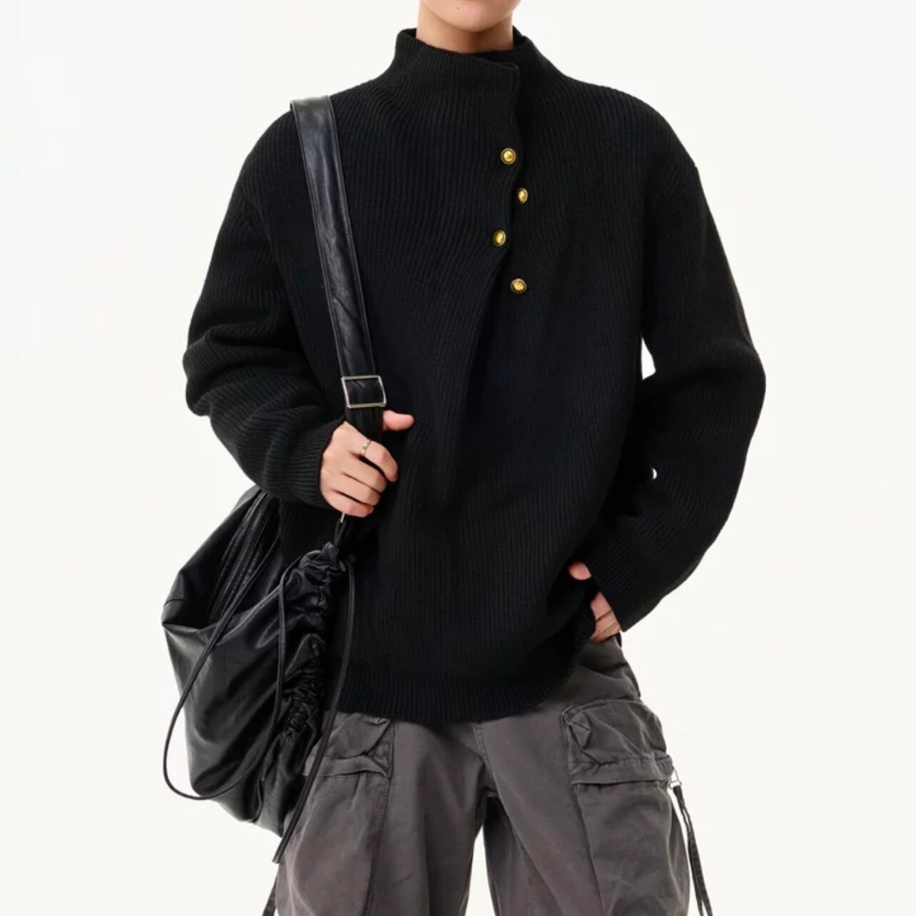 ボタンのデザインがアクセントになり、シンプルなコーディネートに個性をプラスします。
