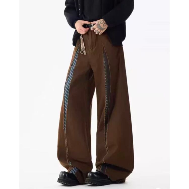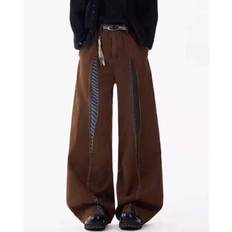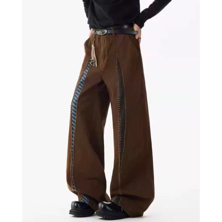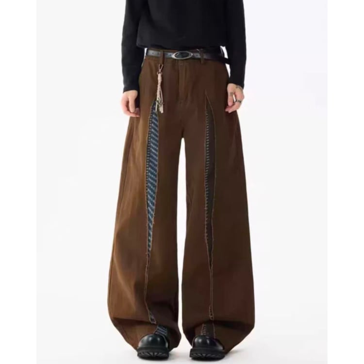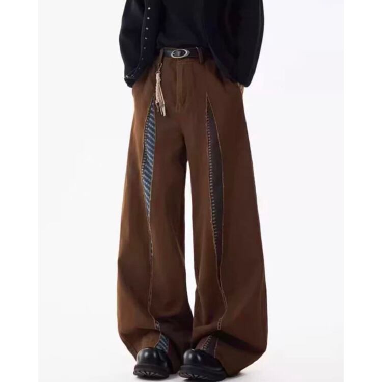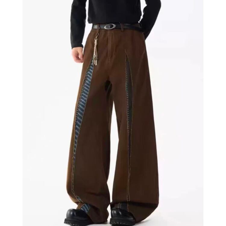 異なる生地を組み合わせたパッチワークデザインが目を引くワイドレッグパンツ。