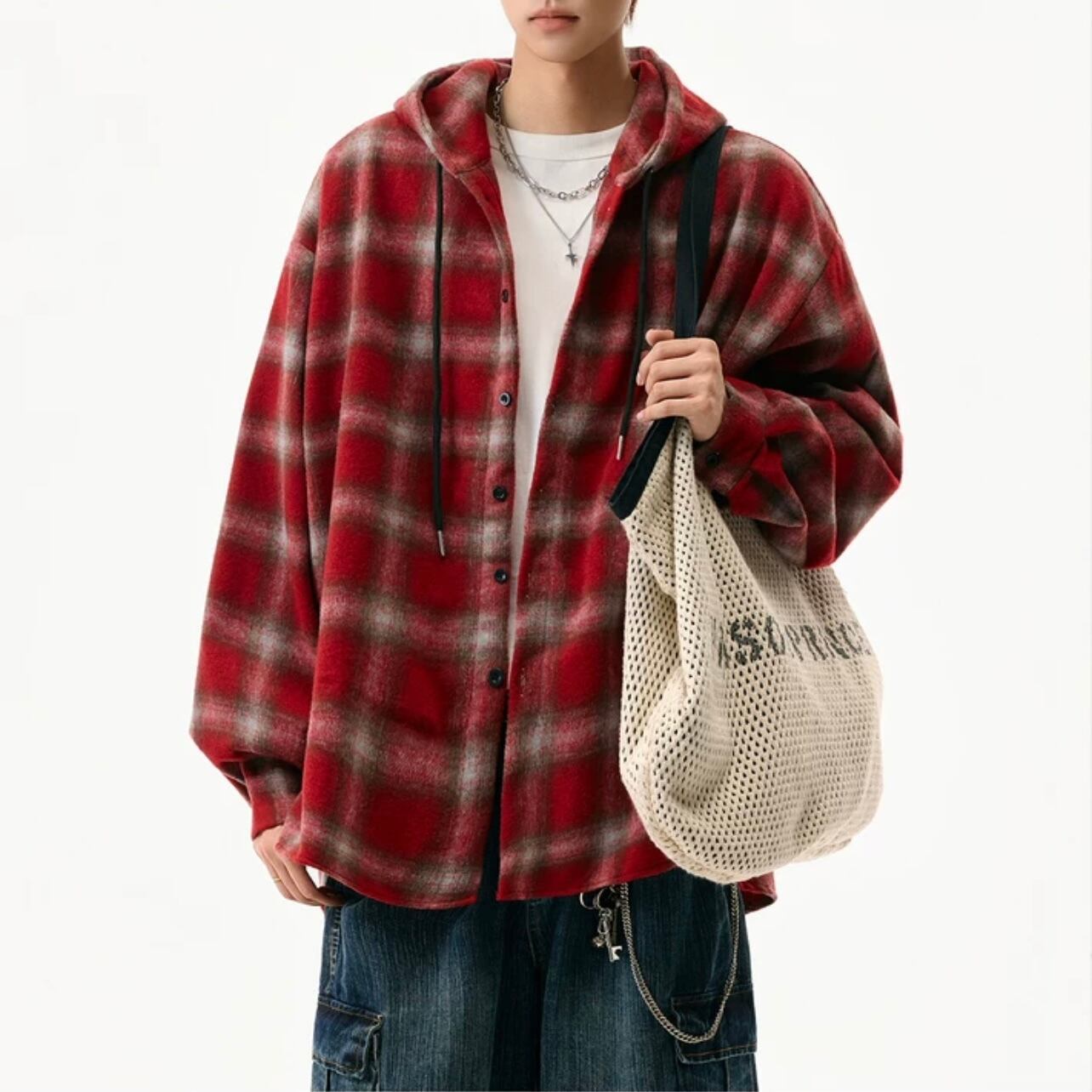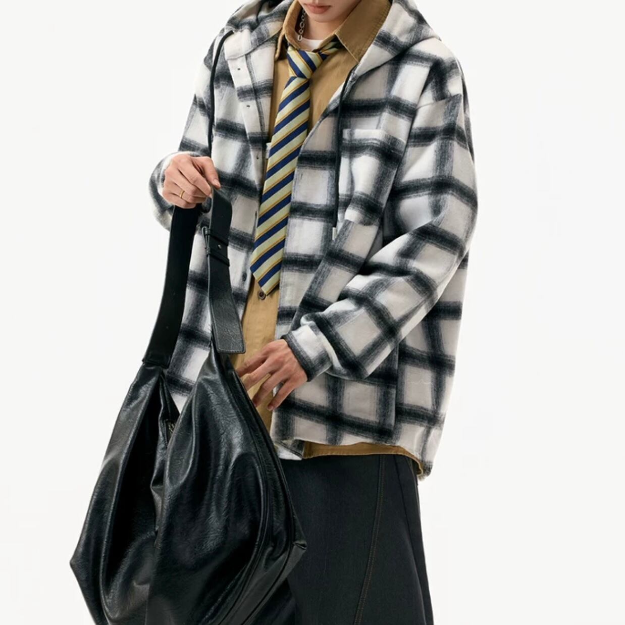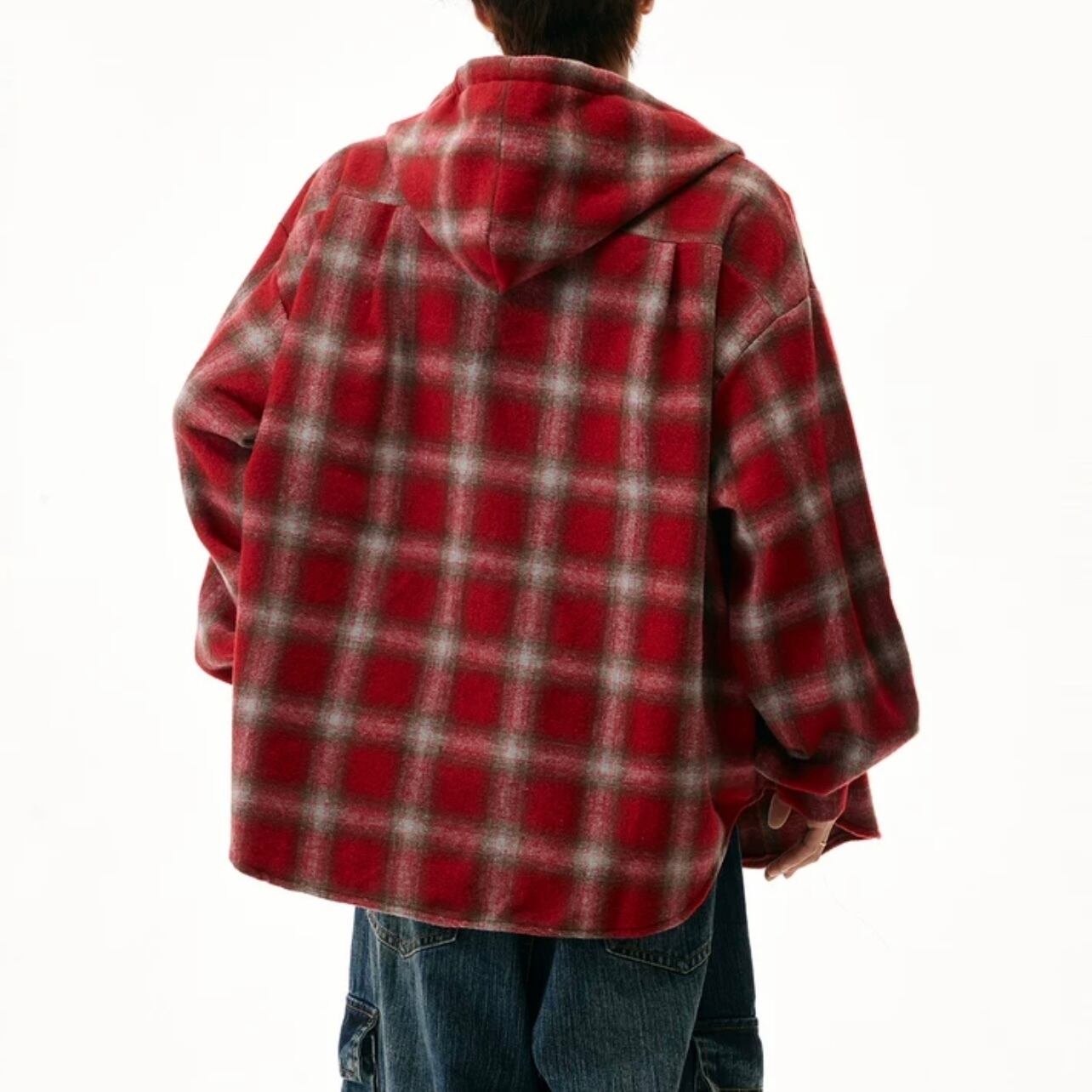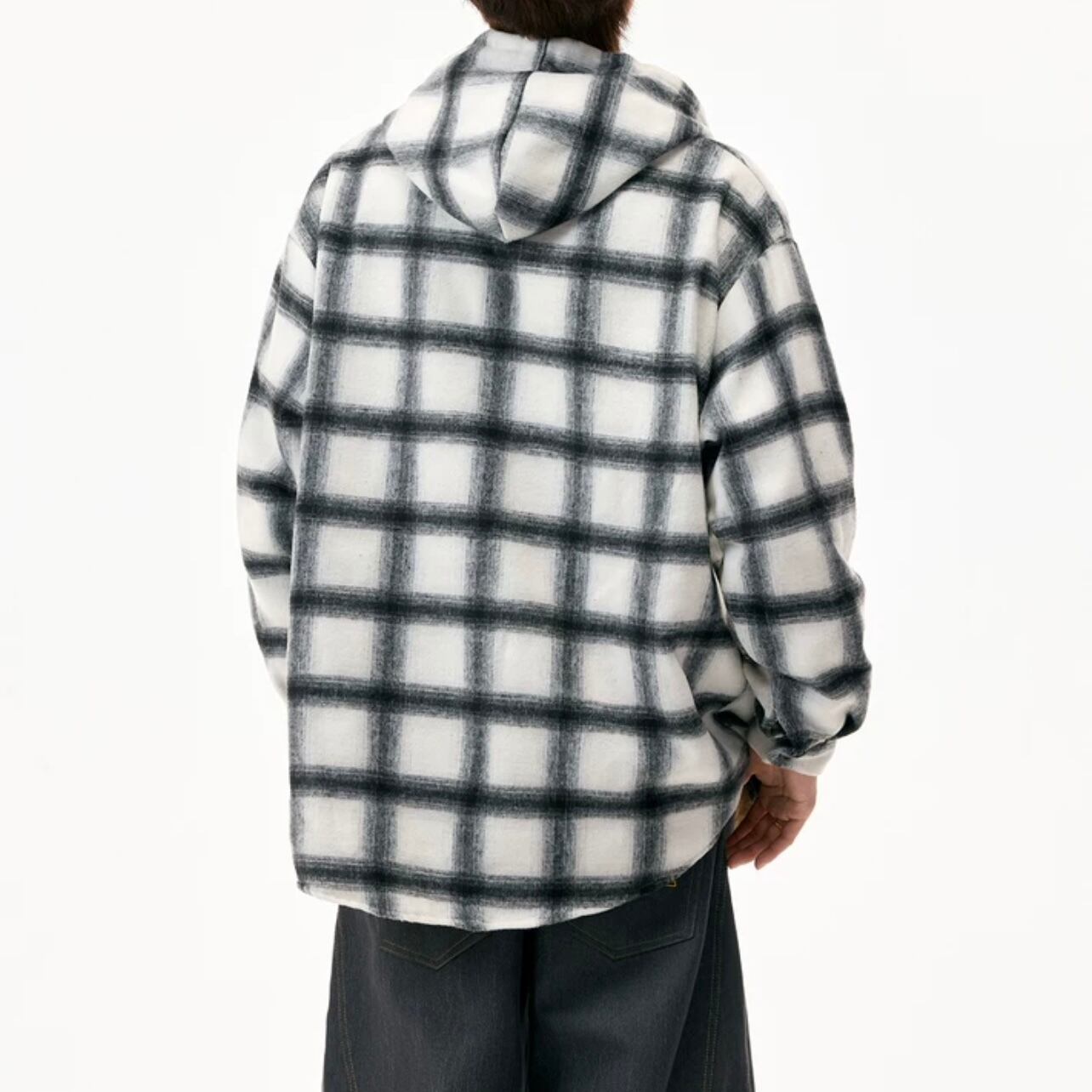 カジュアルな着こなしに最適なチェック柄のフード付きシャツ。