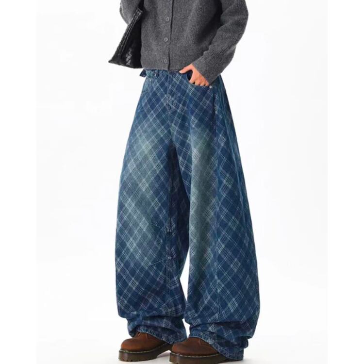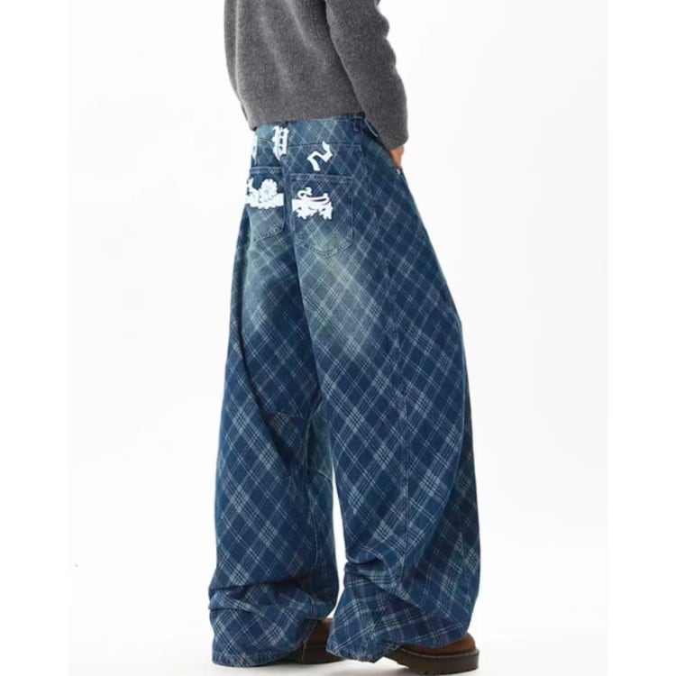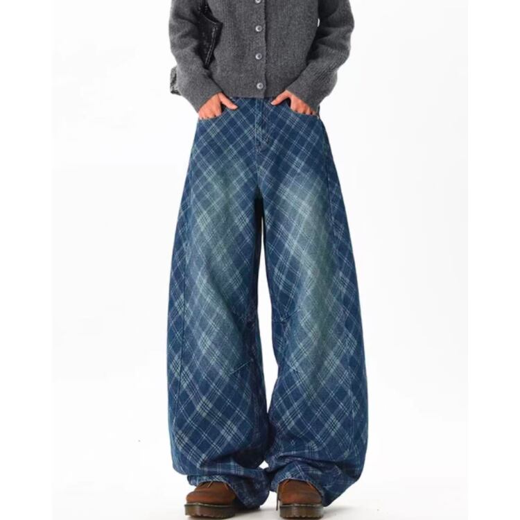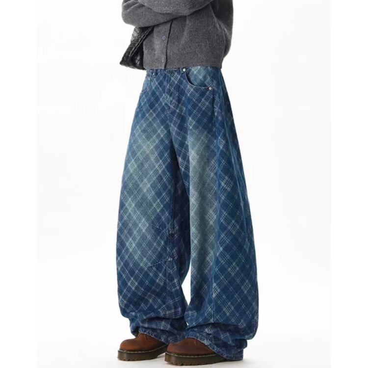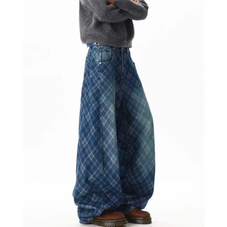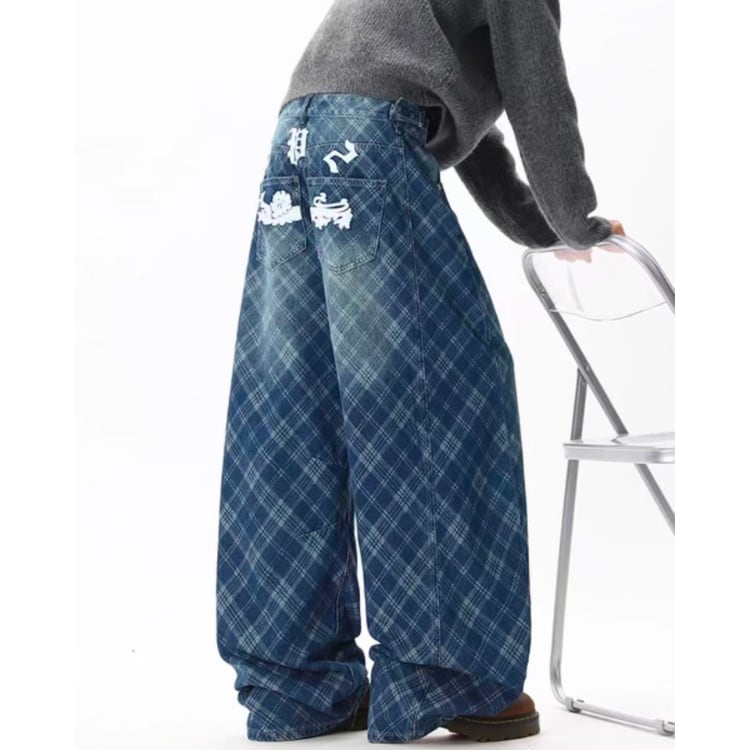 目を引くチェック柄が特徴的なワイドレッグデニム。