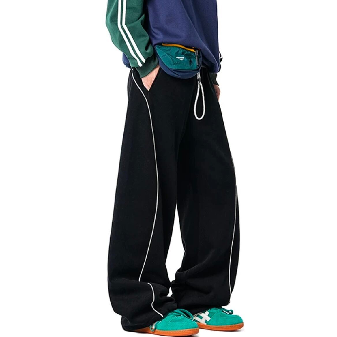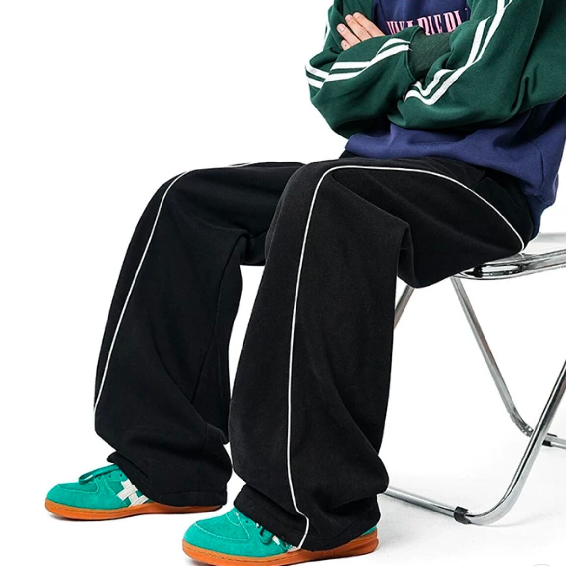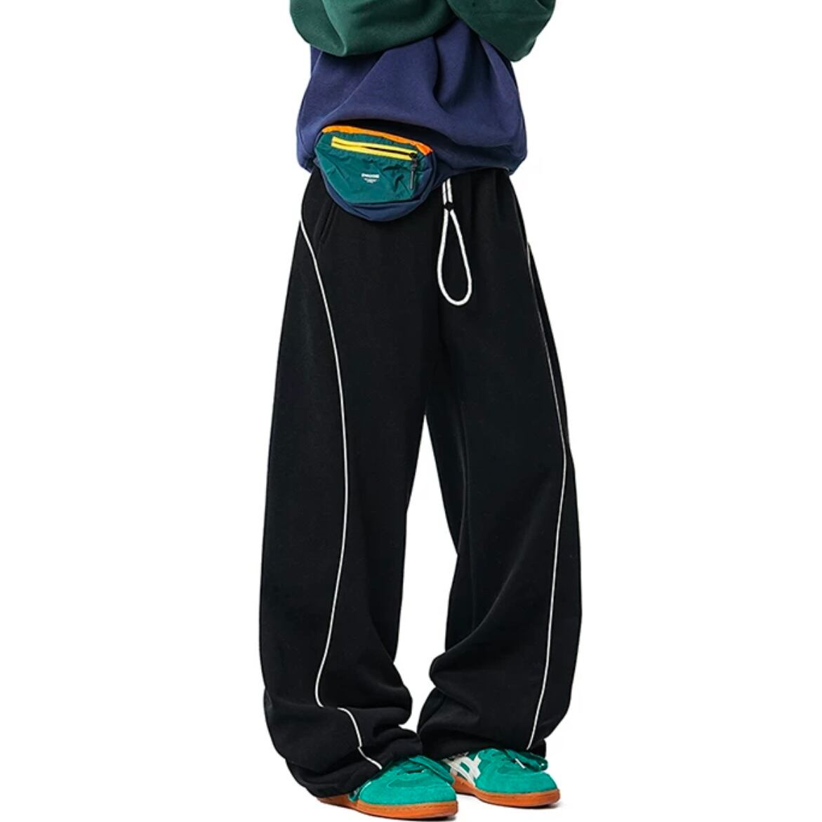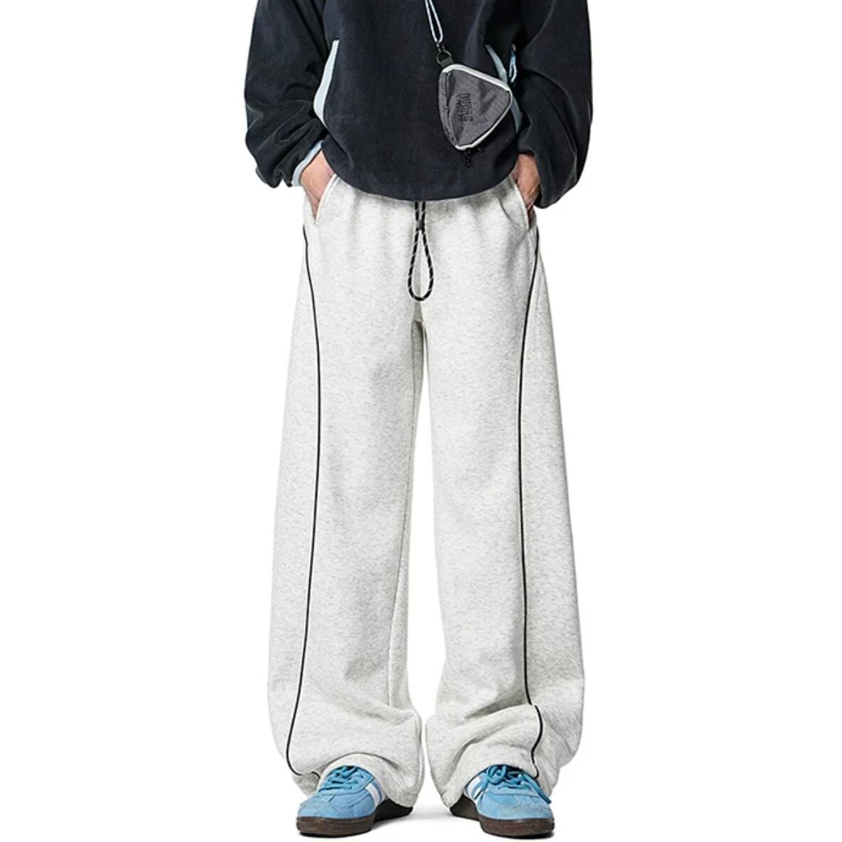 ゆったりとしたワイドシルエットで、ストリート感のあるラインデザインがアクセント。