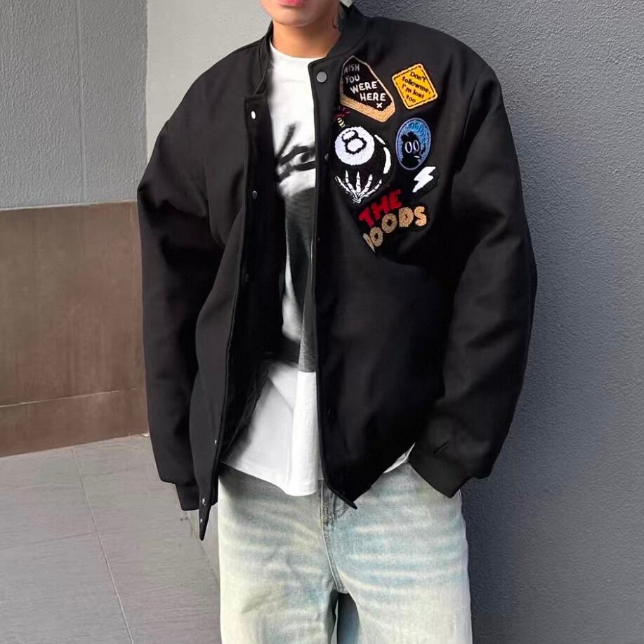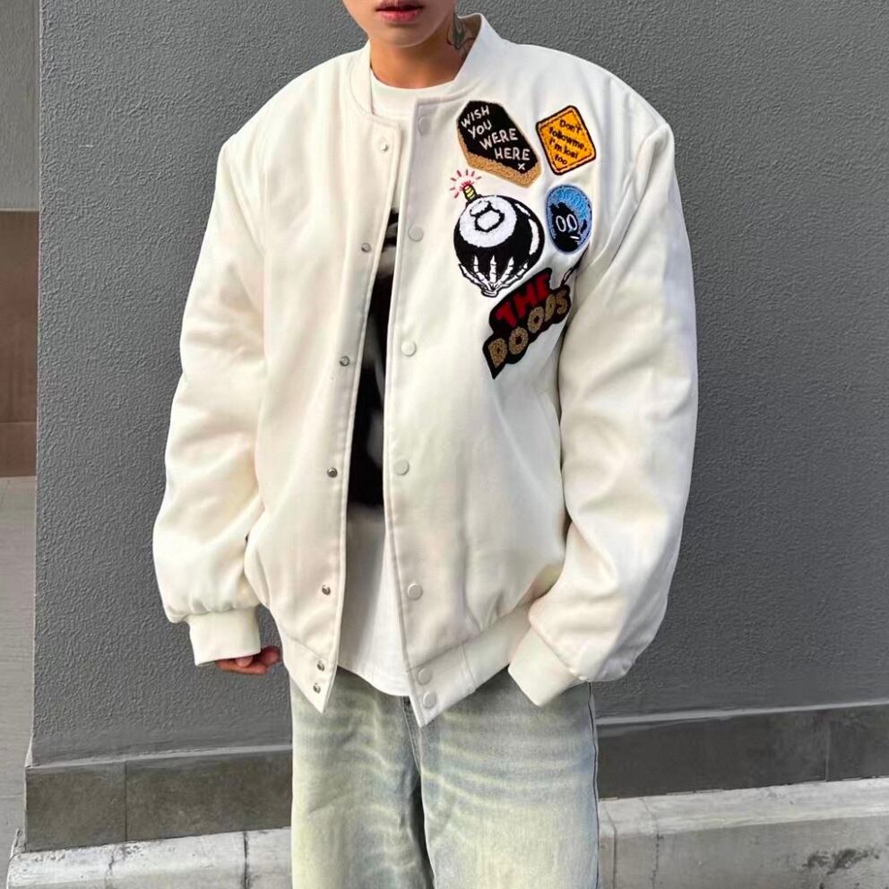 パッチが印象的な、人目を引くデザインのスタジアムジャケットです。 ゆったりとしたオーバーサイズシルエットで、カジュアルな着こなしにぴったり。 普段使いはもちろん、イベントやお出かけにもおすすめです。 ■サイズ 【M】 肩幅:56cm 胸囲:130cm 袖丈:62cm 着丈:70cm 【L】 肩幅:57cm 胸囲:134cm 袖丈:64cm 着丈:72cm 【XL】 肩幅:58cm 胸囲:138cm 袖丈:66cm 着丈:74cm ※目安となります。測り方により、2〜4cm程の誤差がある場合がございます。 ■カラー アイボリー / ブラック ■商品の色味は、お手持ちのスマートフォンの 画面によって実物と若干異なる場合がございます。 ■素材 ポリエステル100% ■【お手入れ方法】 濃色と淡色の衣類は分けて洗濯してください。 ぬるま湯で優しく手洗いし、軽くすすぐ程度でOKです。 黒色生地は、初回〜数回の洗濯で色落ちや毛羽立ちが見られる場合がありますが、素材の特性によるもので不良ではございません。予めご了承ください。 ●●ご購入前に必ずご覧下さい●● こちらをお読みいただき、ご了承いただいた上でご購入をお願いいたします。 →https://shop.motico.jp/about ●注意事項● ・タイミングによっては 商品在庫切れにより注文キャンセルとさせていただく恐れもございます。予めご了承くださいませ。 ・発送までに「1週間〜3週間前後」のお時間をいただきます。 ・こちらは輸入品となります。日本製とは検品基準が異なる為、新品未使用品でもごくわずかな汚れや傷がある場合もございます。 ・光の当たり具合やお使いの端末の関係上、実際の色合いと若干差が出る可能性がございます。 ・イメージ違いやサイズ交換等、お客さまご都合による交換、返品は対応出来かねます。 ■梱包について---------------------------------------------- エコに配慮して簡易包装にてお届けさせて頂いております。
